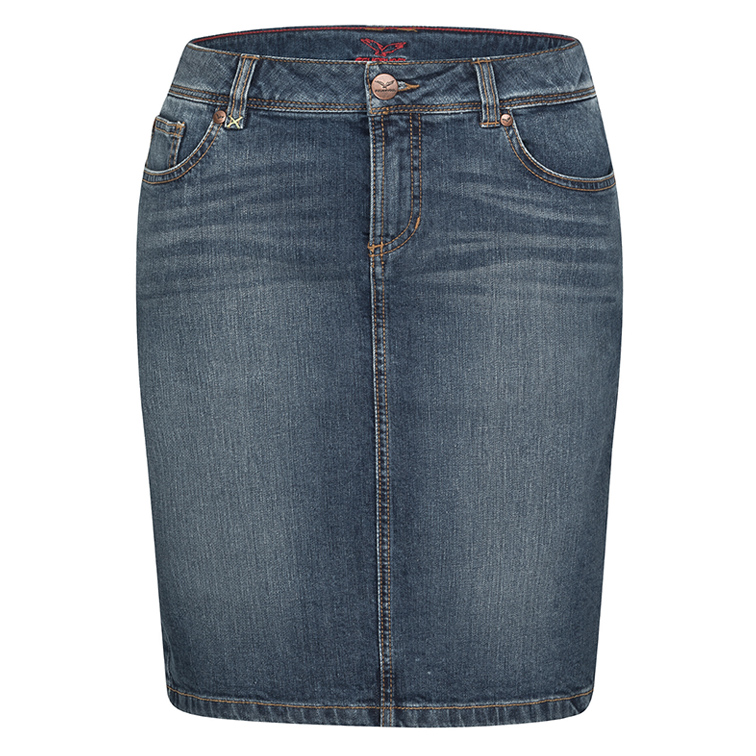 Jeans-Bleistiftrock von Feuervogl aus hochwertigem Denim in klassischer Länge. Anliegender Bund mit Gürtelschlaufen, Knopf und 5-Pocket-Design.